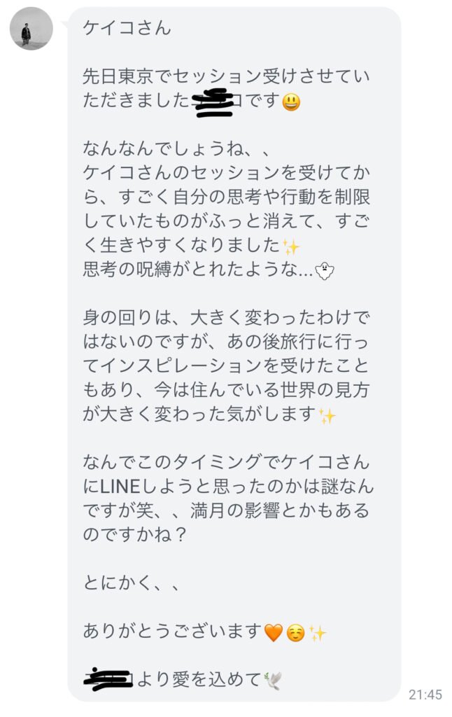 東京でのシンクロ・セッションを受けていただいたYさんから、嬉しいメッセージをいただきました。